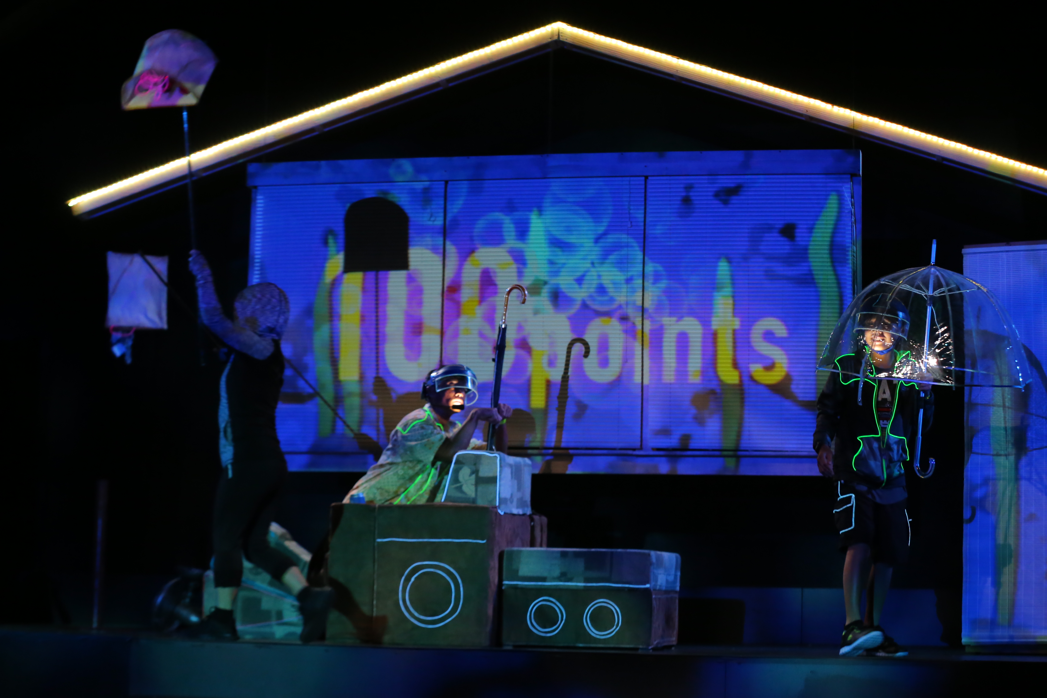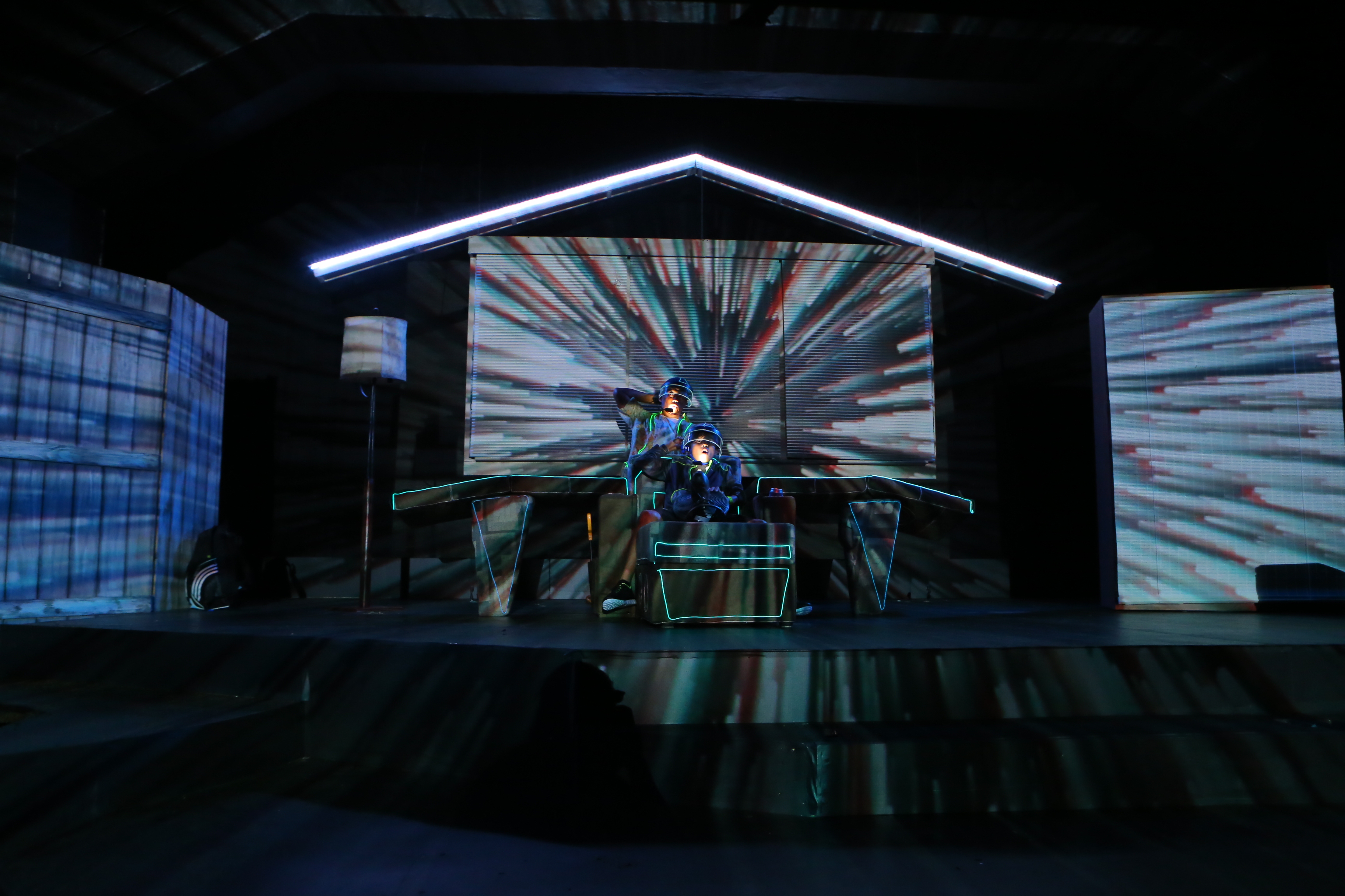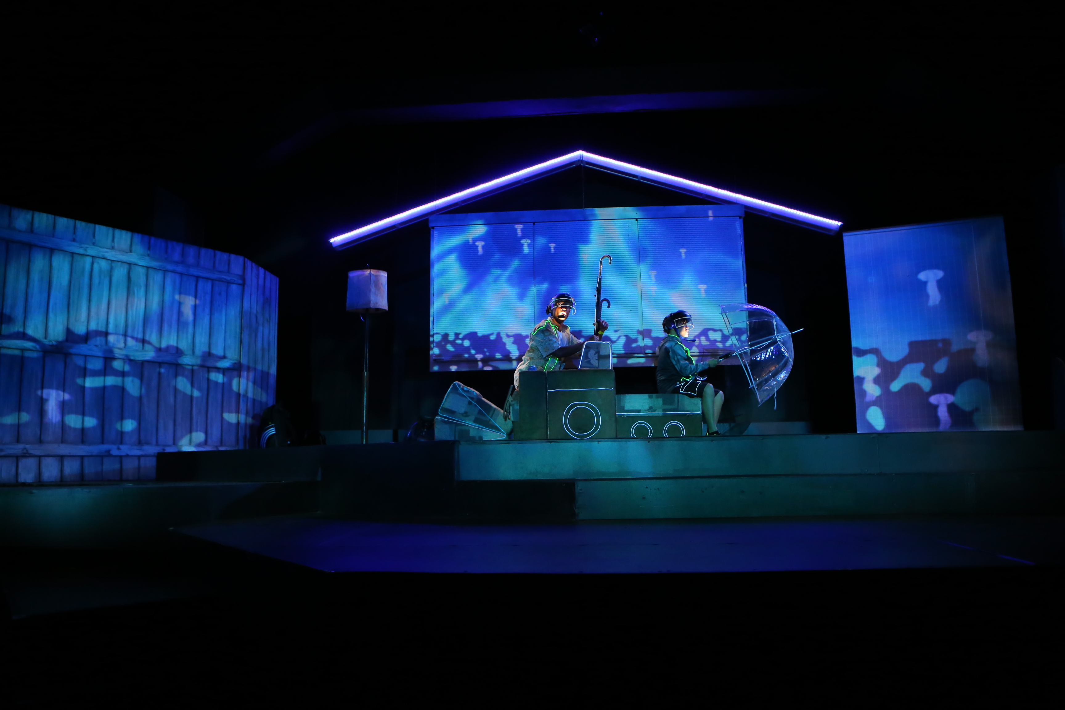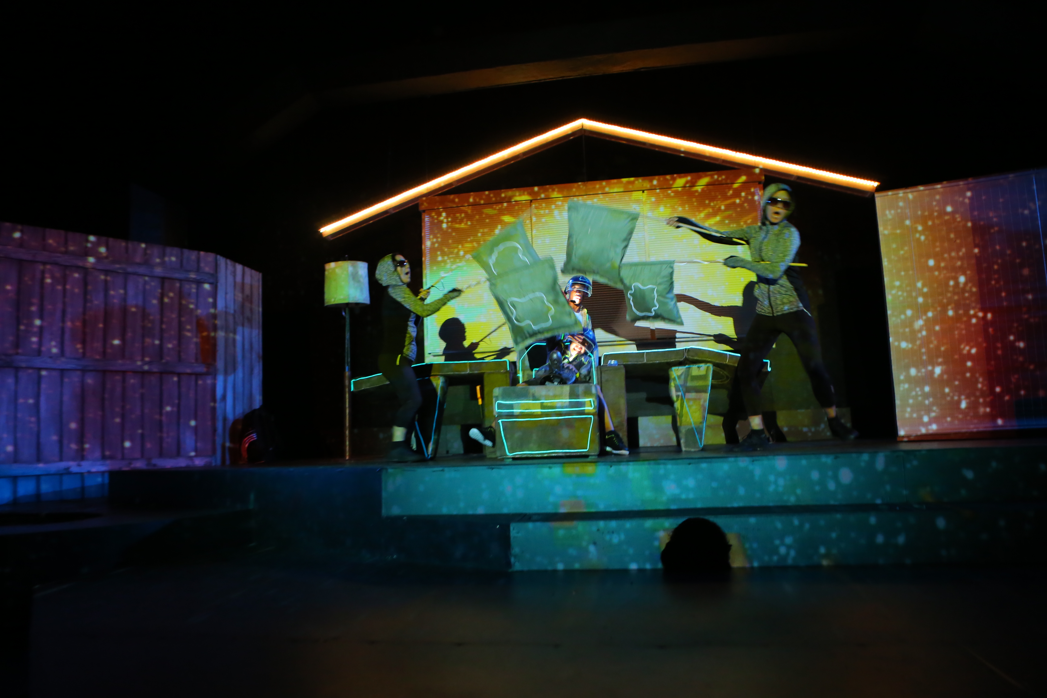 All animation created in Adobe After Effects and triggered and mapped to scenic surfaces using TroikaTronics Isadora.