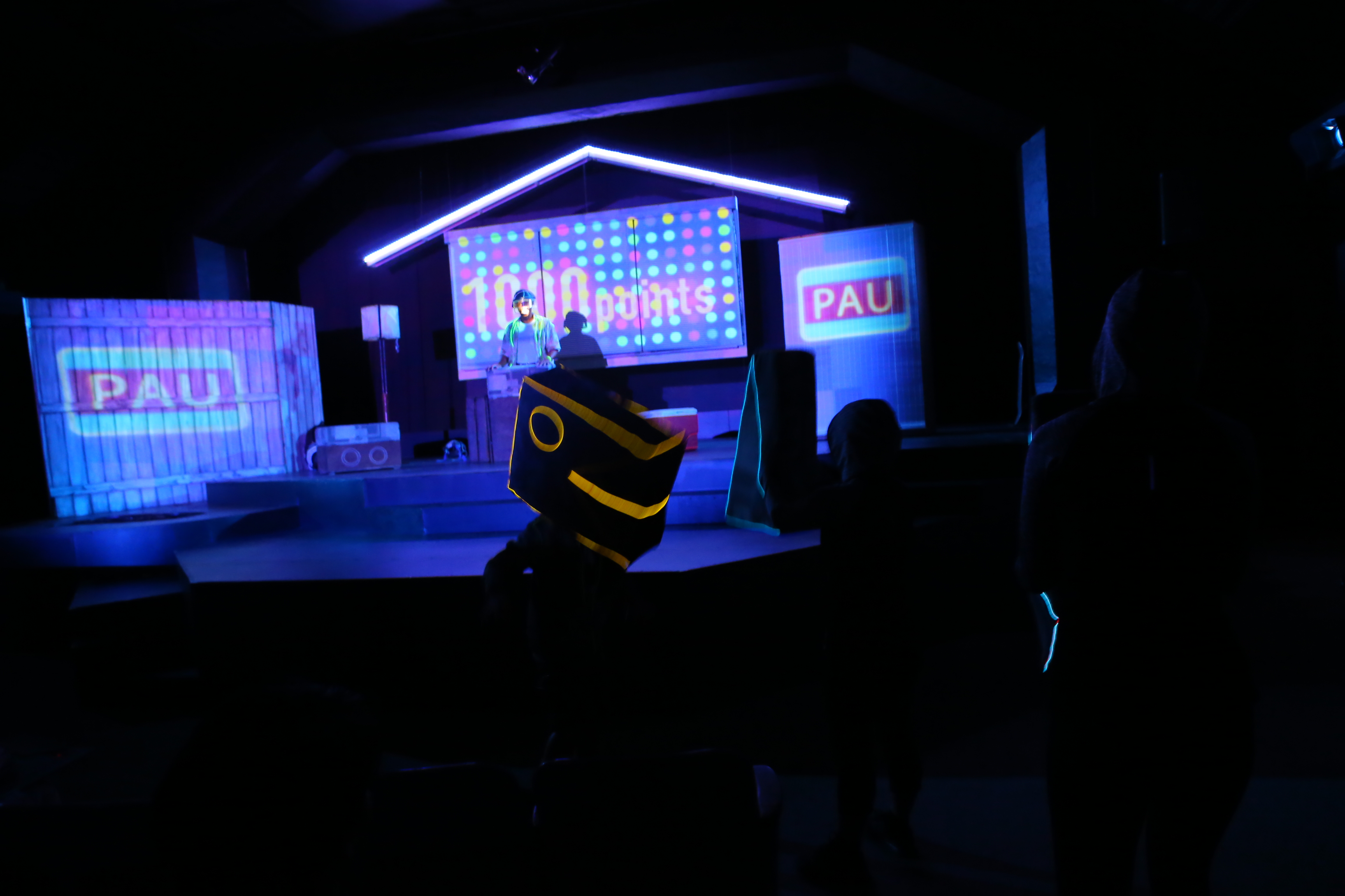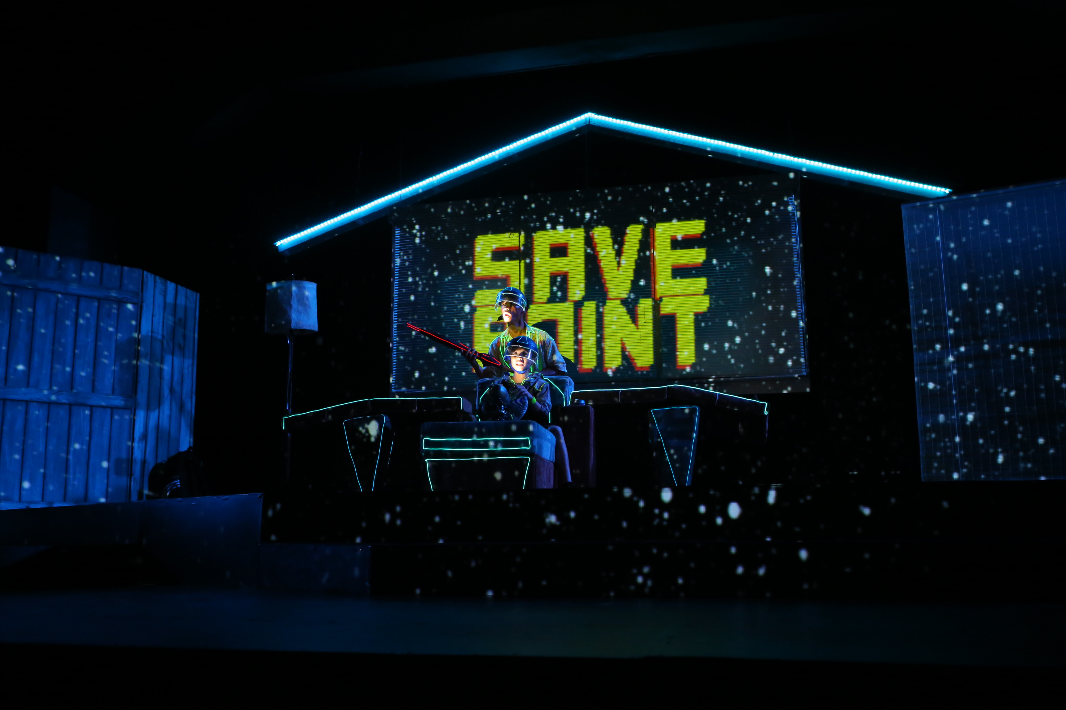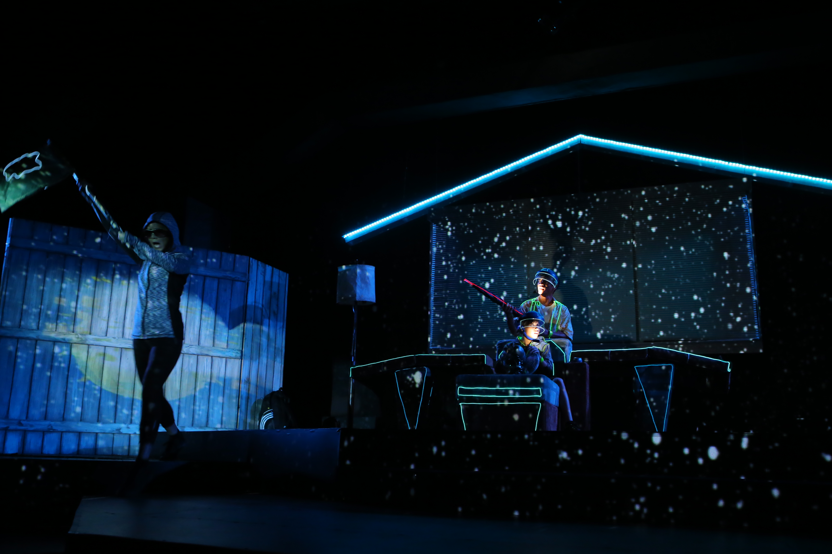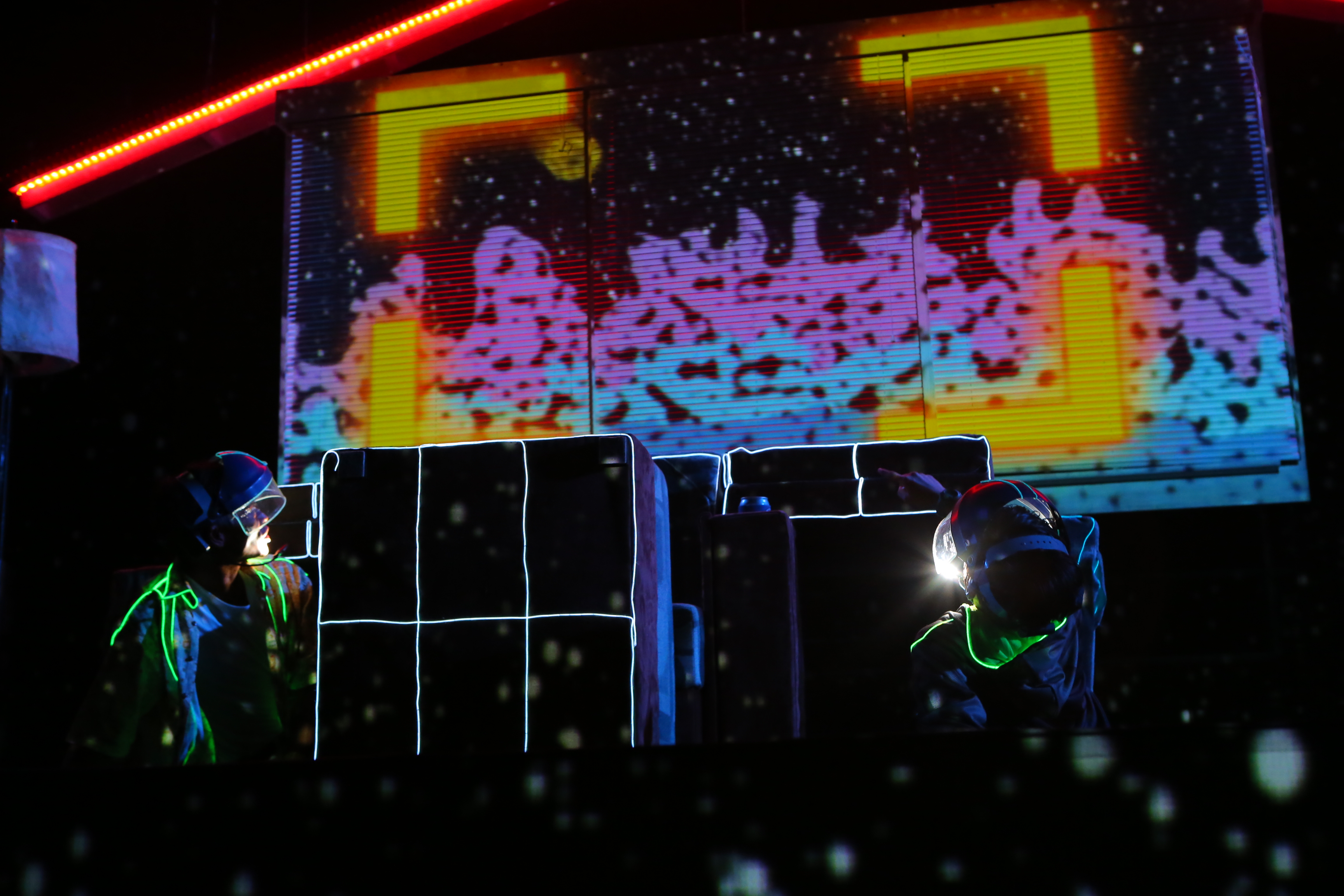 All animation created in Adobe After Effects and triggered and mapped to scenic surfaces using TroikaTronics Isadora.