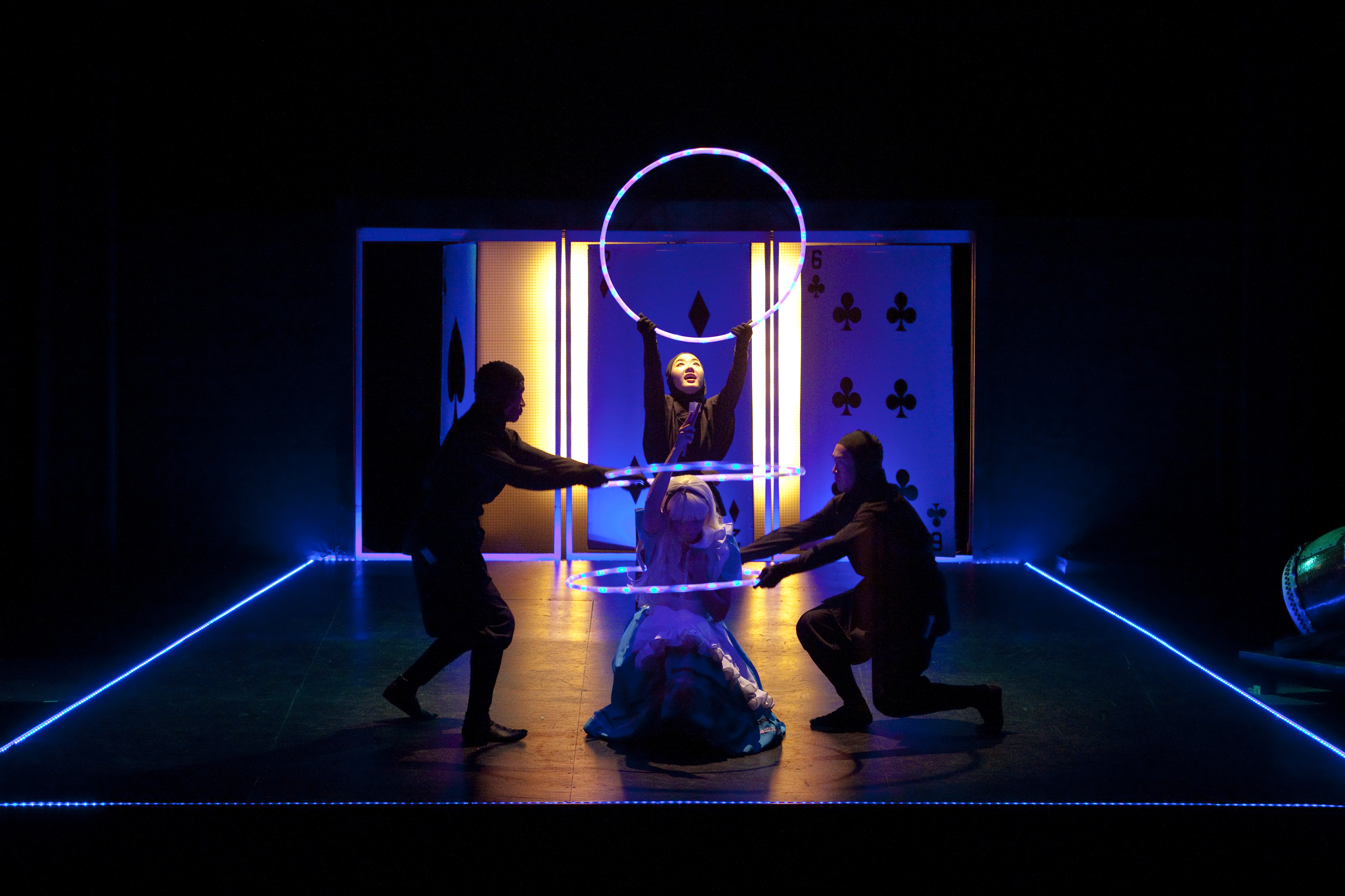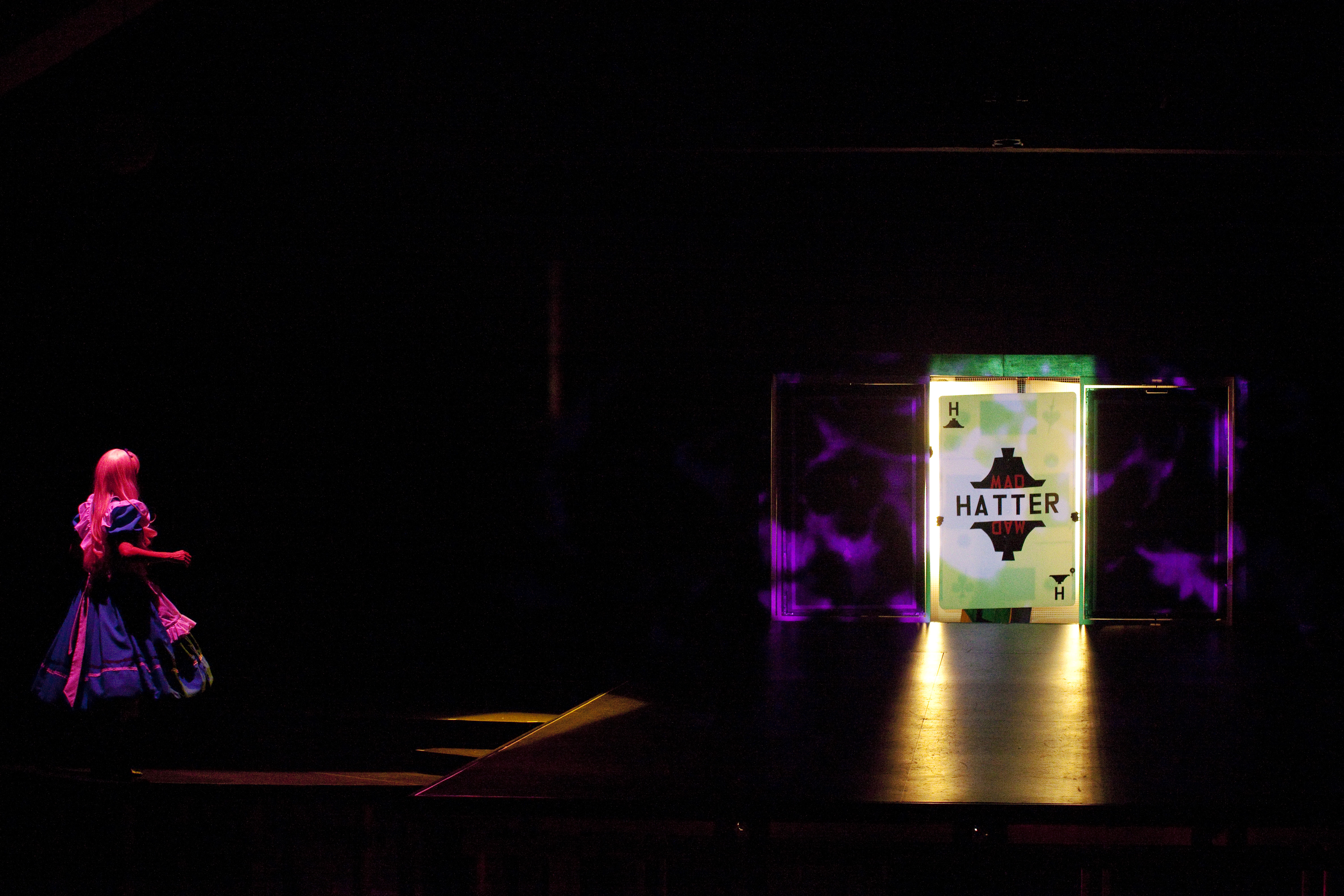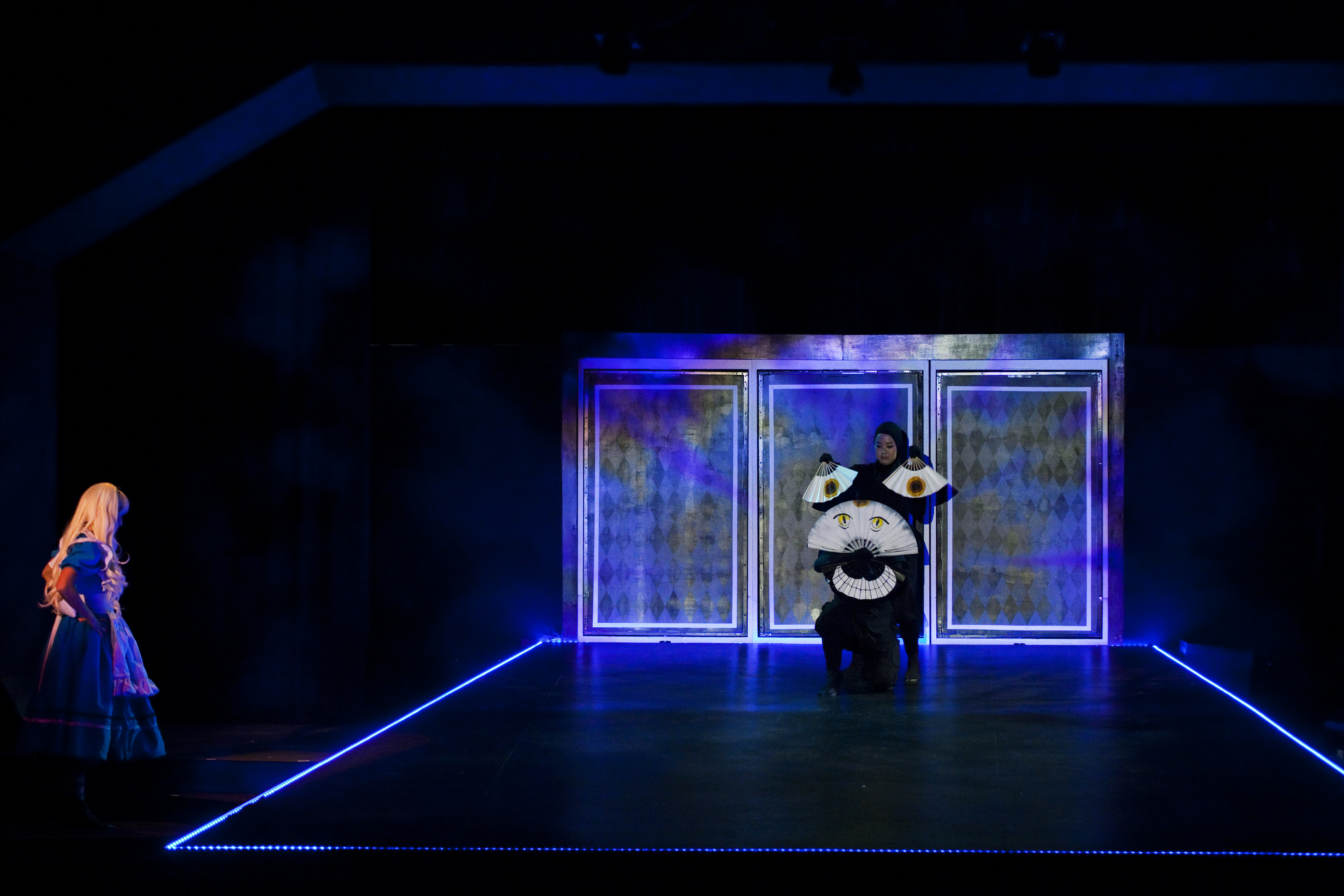 The fans that created the Cheshire Cat were lit using a projected “rippling tiger stripes” pattern that followed the puppet around the stage like a follow spot thanks to a series of Isadora triggers.