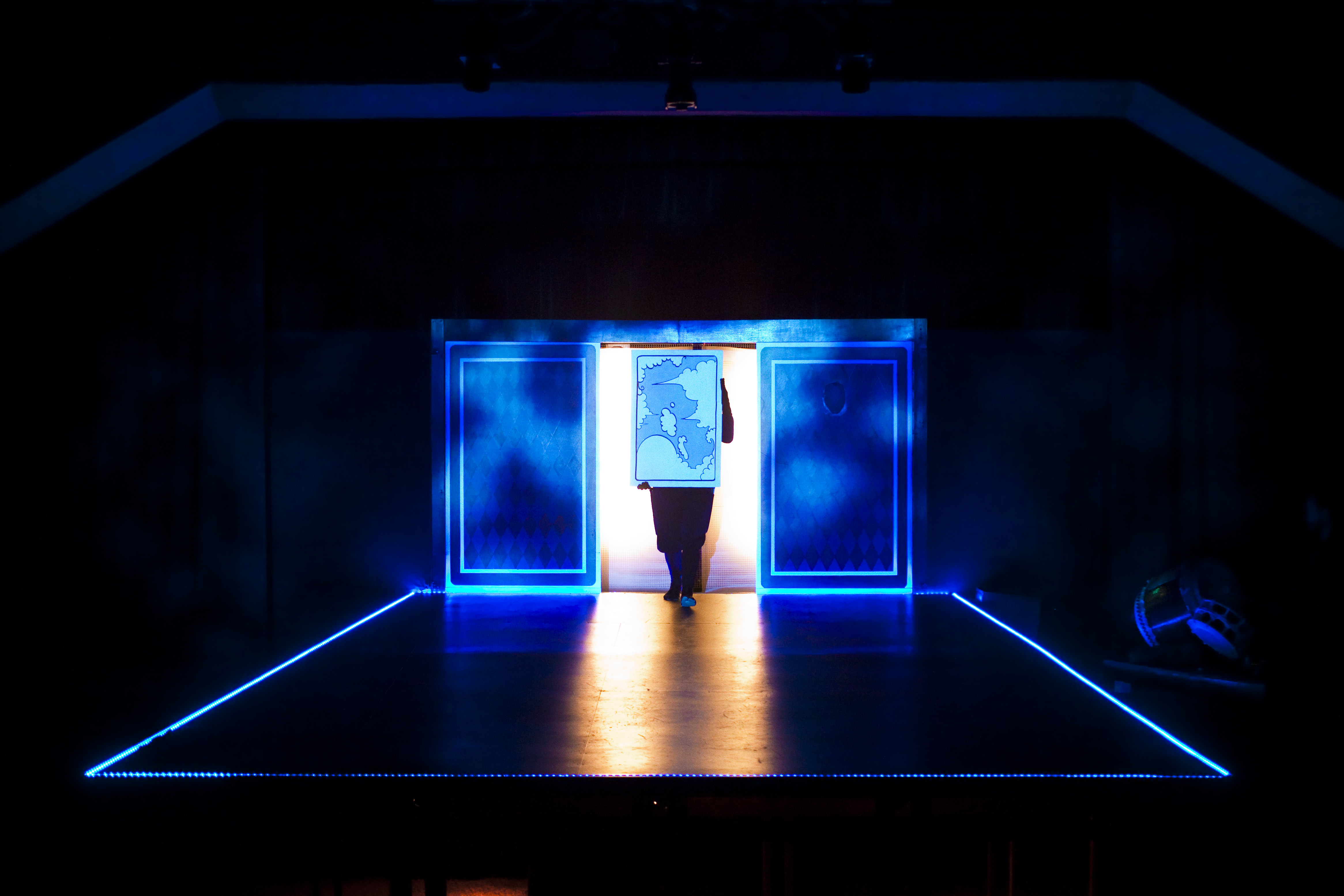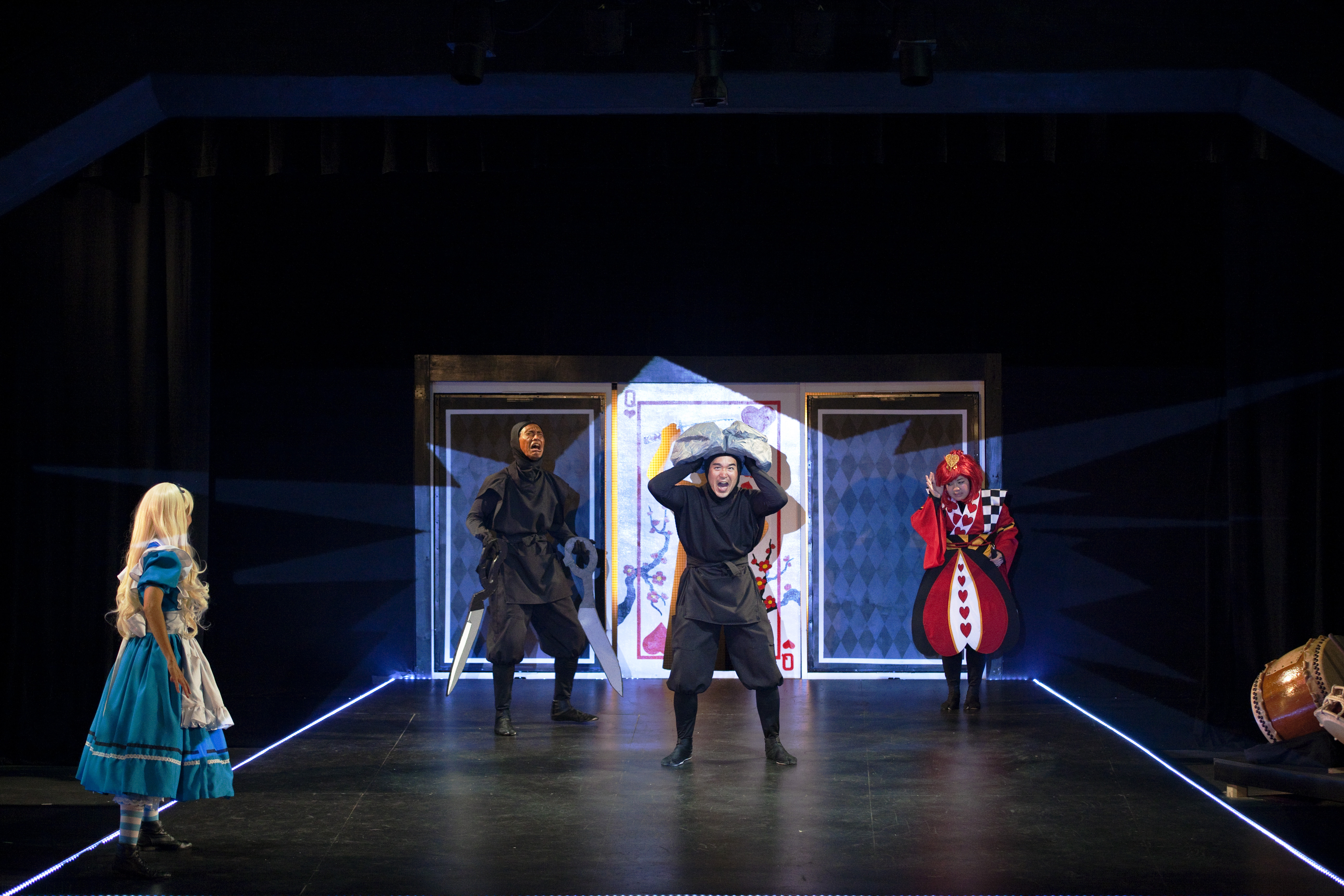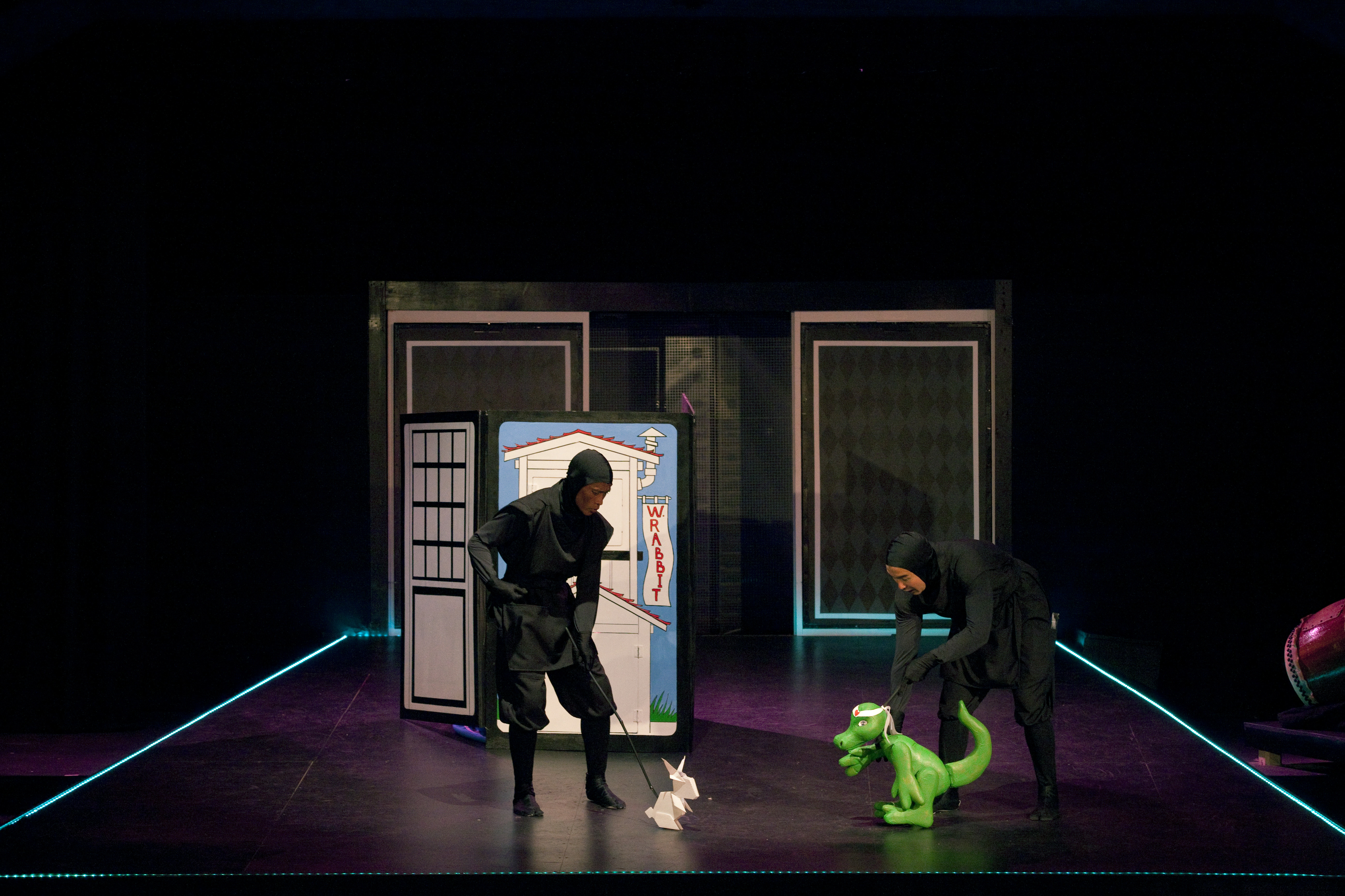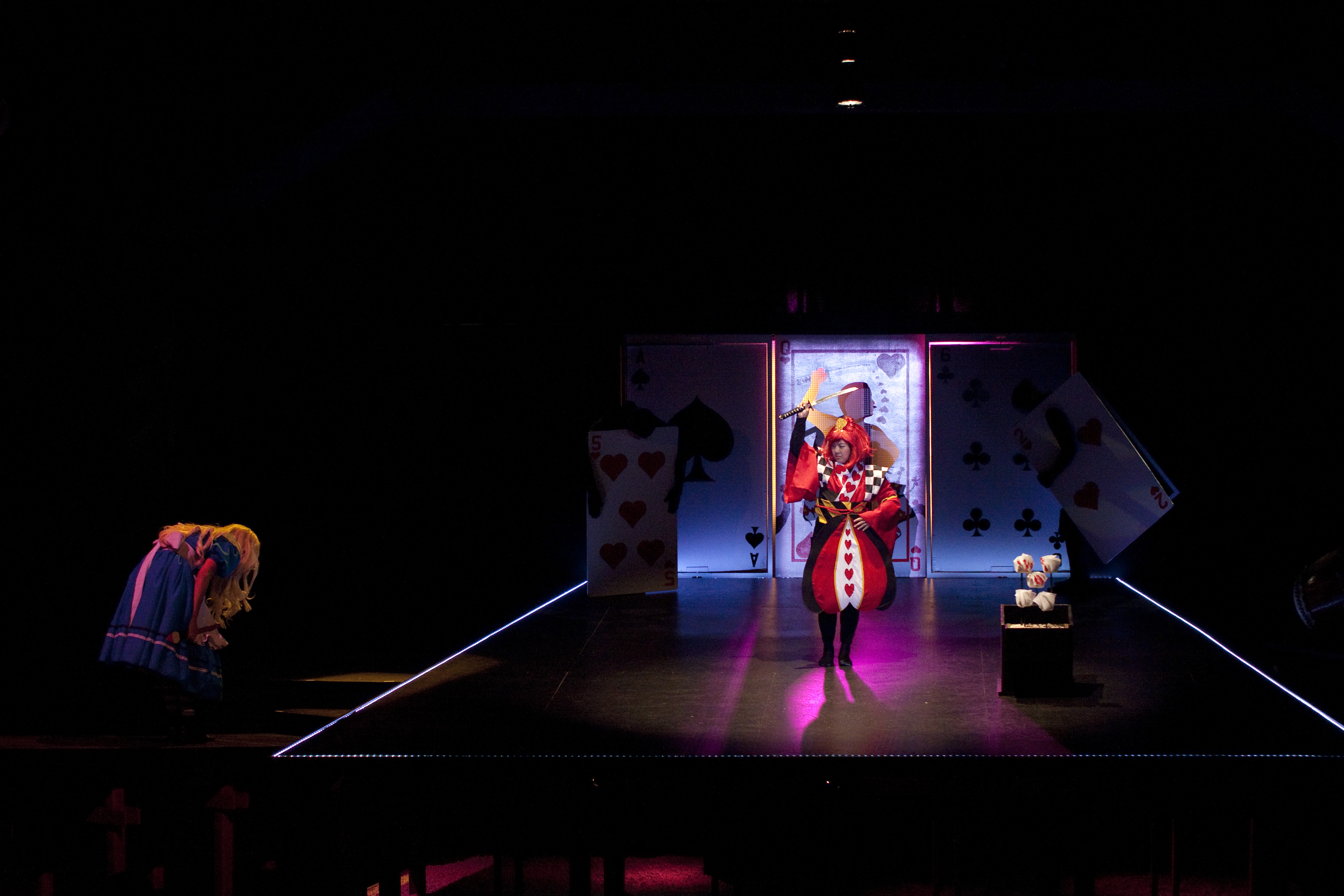 The fans that created the Cheshire Cat were lit using a projected “rippling tiger stripes” pattern that followed the puppet around the stage like a follow spot thanks to a series of Isadora triggers.